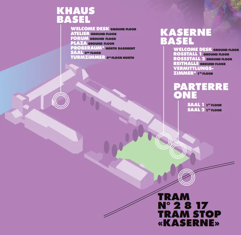 Die Kaserne Basel, das kHaus und das Parterre One liegen auf dem Kasernenareal. Das Kasernenareal befindet sich in Kleinbasel, nah am Rhein zwischen der Mittleren Brücke und der Johanniterbrücke. Erreichbar ist das Areal mit den Tramlinien 2, 8 und 17 (Haltestelle Kaserne Basel, Klybeckstrasse). Von der Haltestelle aus gesehen, liegt die Kaserne Basel im rechten Seitenflügel, das kHaus erreichst du geradeaus über den Platz und das Parterre One befindet sich rechterhand in der Ecke des Areals. Informationen zur Zugänglichkeit der einzelnen Räume in der Kaserne, dem kHaus und dem Parterre One erfährst du in den Infos zu den Programmpunkten auf der Eventwebseite. Ergänzende Informationen zur Barrierefreiheit der Kaserne Basel sind separat verfügbar: Zugänglichkeit der Lokalität